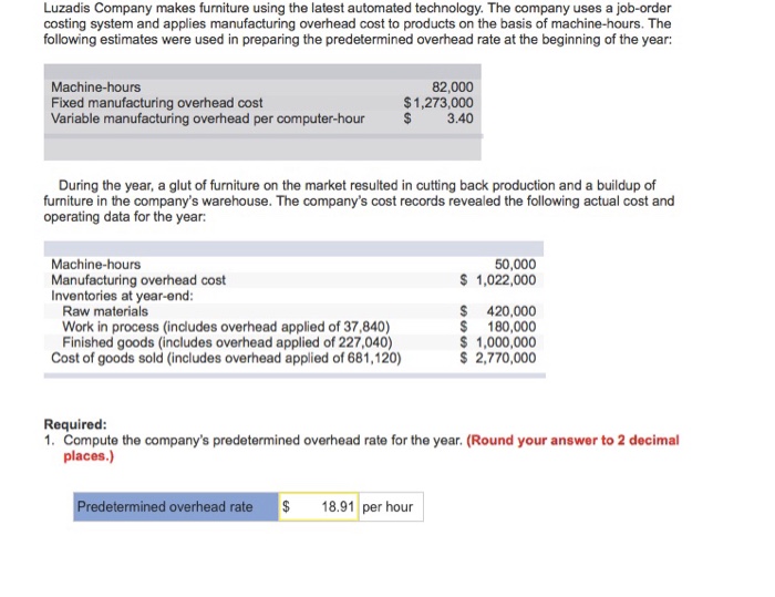 . Luzadis Company makes furniture using the latest automated technology. The predetermined overhead rate was based on a cost formula that estimates 980000 of total manufacturing overhead for an. Luzadis Company makes furniture using the latest automated technology.